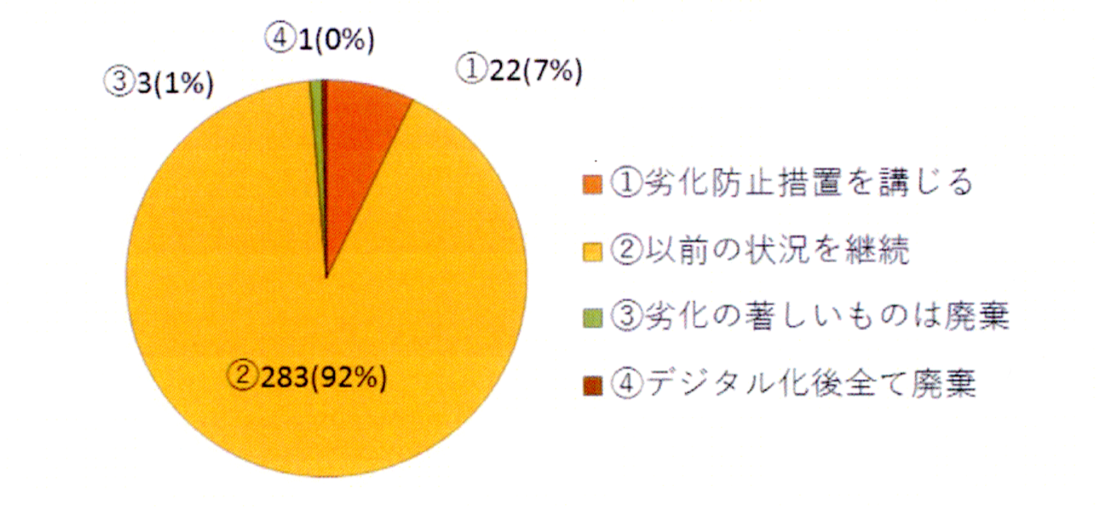 図面の電子化と比較すると、ともに報告書作成に伴う比重が大きい方向性は一致している。しかし差異に目を転じると、変退色というフィルム特有の要因が作用して、劣化対策のために電子化を実施していることがよくわかる。両アンケートを合わせ考えると、保存や保管のために電子化するフィルムと報告書作成のために電子化する図面という構造が存在しているといえよう。