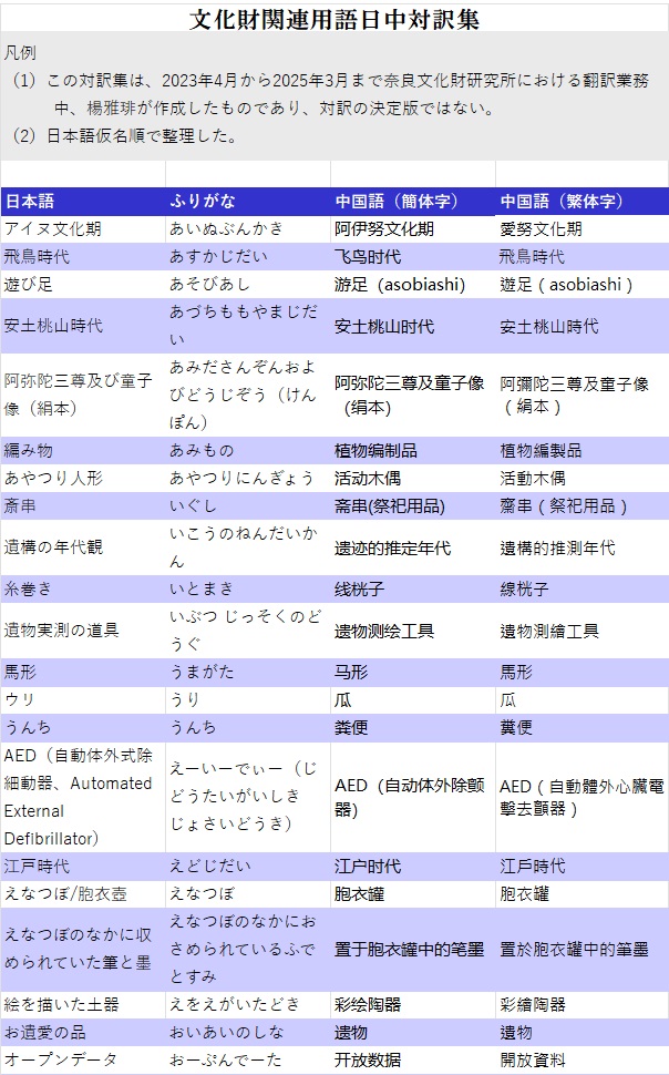 楊雅琲「文化財関連用語日中対訳集」『文化財多言語化研究報告5』