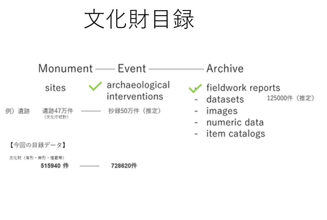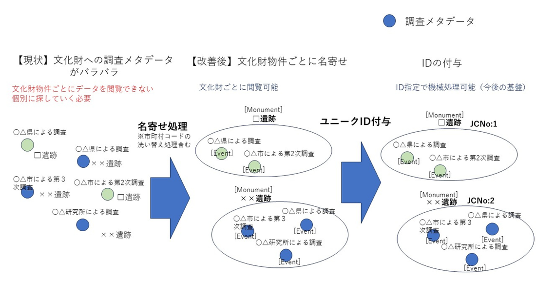 Monument(遺跡) - Event(調査) - Report(報告書) として体系化し、名寄せ処理によって遺跡ごとにオリジナルIDを付与することによって文化財類型や調査組織を超えた情報の紐づけが可能となる。