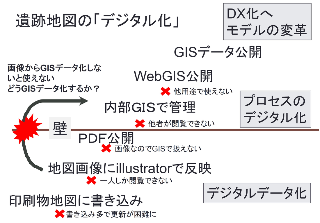 遺跡地図をデジタルとして扱うにはデジタル化が必要であるが、画像のデジタル化のみでは用をなさない。デジタル化された画像データではなく、GISデータにする必要がある。そのため、紙・PDFとGISデータに壁があり、機械可読なGISデータに変換していく必要がある(画像 遺跡地図のデジタル化)。