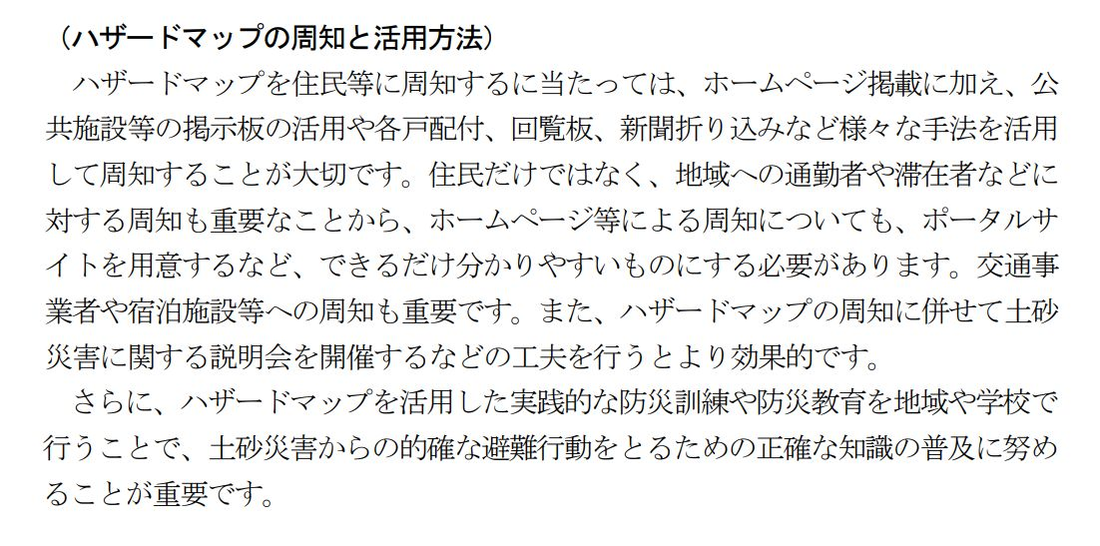 参考事例としてハザードマップがある。土砂災害防止法(土砂災害警戒区域等における土砂災害防止対策の推進に関する法律、2001年施行)は、「土砂災害から国民の生命を守るため、土砂災害のおそれのある区域について危険の周知、警戒避難態勢の整備、住宅等の新規立地の抑制、既存住宅の移転促進等のソフト対策を推進しようとするもの」である(1)。土砂災害防止法第八条においては「必要な事項を住民等に周知させるため、これらの事項を記載した印刷物の配布その他の必要な措置を講じなければならない。」とされる。さらに、国土交通省砂防部による「土砂災害警戒避難ガイドライン」(2)では、ハザードマップのホームページ掲載、公共施設等の掲示板活用、各戸配布、回覧板、新聞折り込みなどを挙げている。