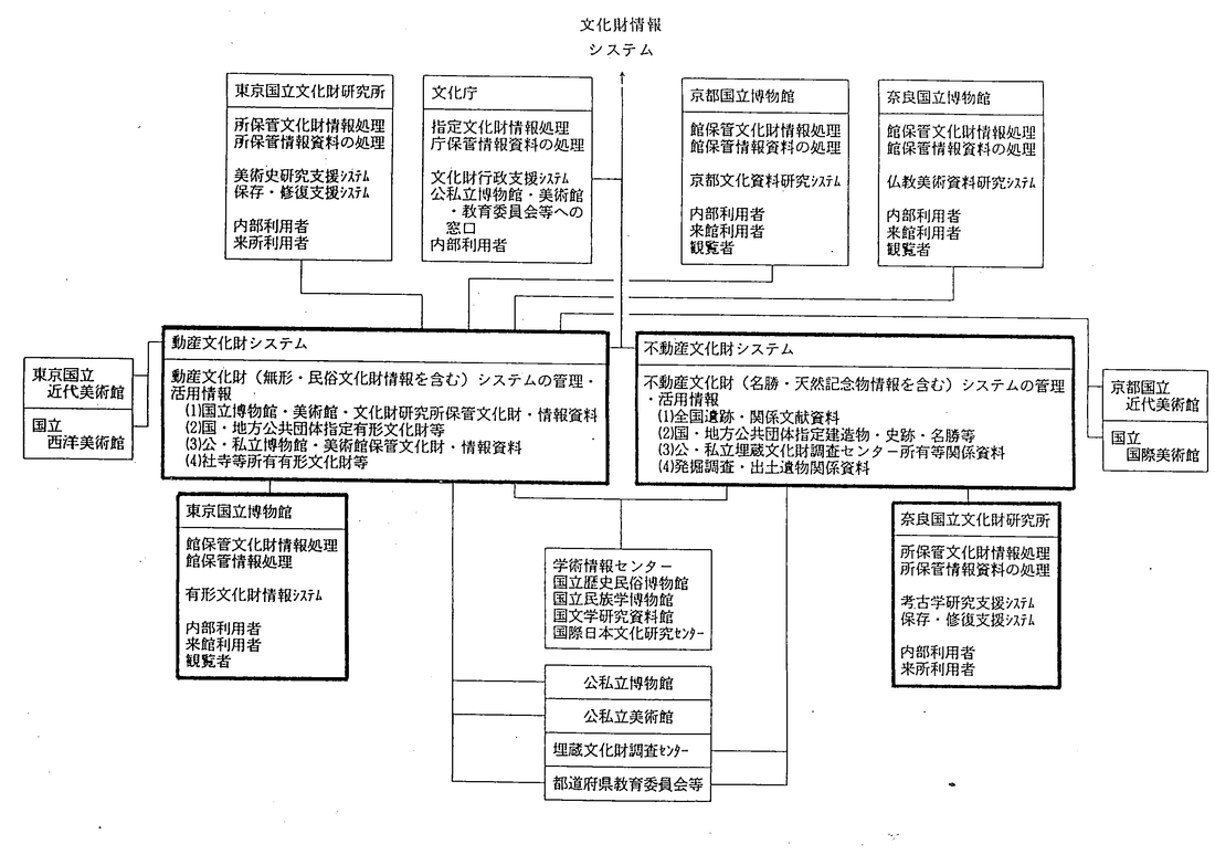 奈良文化財研究所では1970年代からコンピュータ利用を模索し始めた。1990年代からは、不動産文化財データベース構想を検討した。不動産文化財に関する情報処理システムを構築し、各地の埋蔵文化財センターや教育委員会をオンラインで結ぶ構想である。不動産文化財システムの管理を奈良文化財研究所が担う構想である(画像 文化財情報システム概念図)。1995年には予算要求・定員増の要求がなされるが成就しなかった。しかし、遺跡データベースの運用を開始し、1994年から2019年までに約48万件の遺跡情報を整理した。