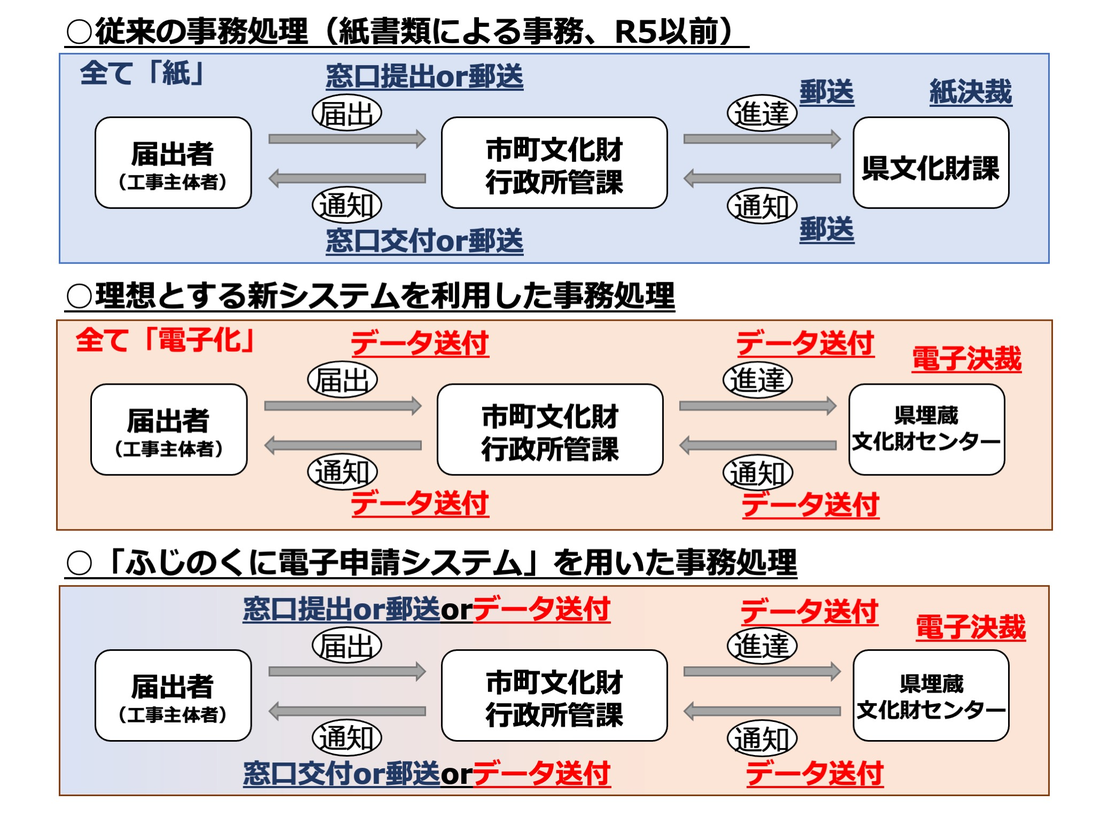 令和5年度以前、一部を除く県内の多くの市町では、窓口で届出者から紙媒体の届出書類を2部受理し、そのうち1部に資料と意見を付した上で、県担当課である文化財課に進達していた。書類を受け取った文化財課は、提出された資料を参考に届出内容を確認し、取扱に関する通知案について紙媒体による決裁を経た上で、紙に印刷した通知文に知事印と契印を押印して発出していた。