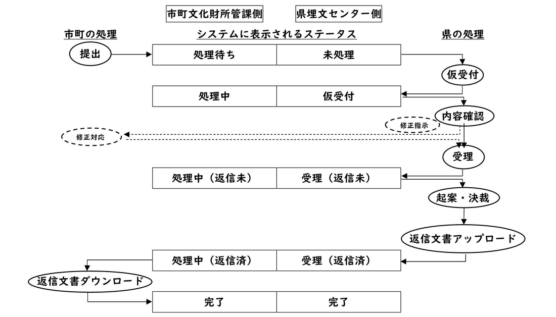 ただし、あくまで県担当と利用者の2当事者の利用を想定したシステムであり、発掘届出事務における実際の流れに即したように、市町を間に入れ込むことはできないことから、上記②のメールによる送受信案に代わる方法として、電子申請システムの利用者側を市町とし、県側で受付を行うこととした。