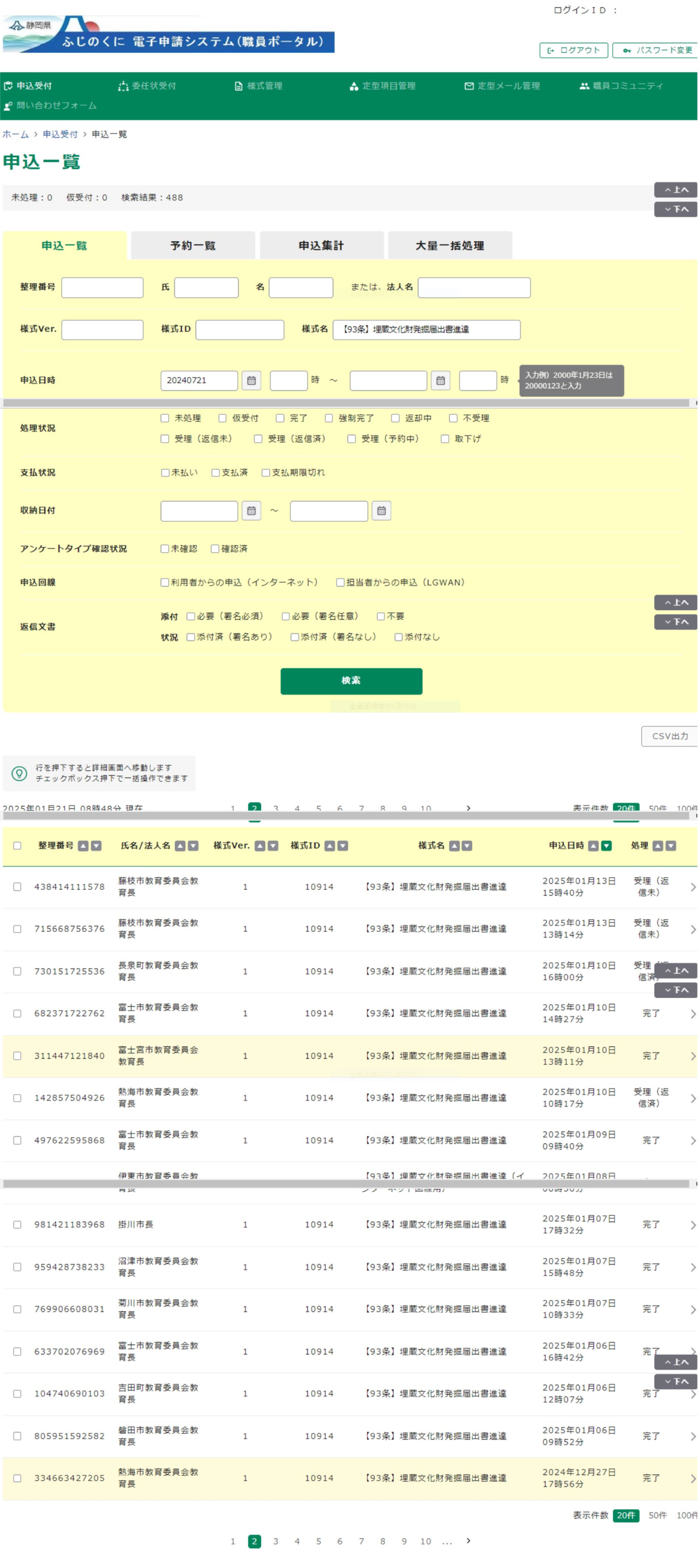 一方、当初は、各市町の担当者が様式に入力することから、利用回線をLGWAN(総合行政ネットワーク)に限定していたが、一部市町では、文化財所管課の所在地が市町の本庁舎ではなく、資料館などの出先機関に所在するため、LGWAN回線が利用できないことが分かった。そのため当該回線を利用できない市町に限り、通常のインターネット回線からの申込を受け付けるように運用を変更した。