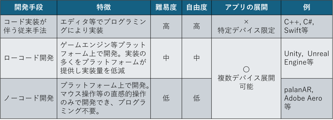 1点目の手段は現在でも主流な開発手段の1つとなっている。開発にはプログラミング、3Dアプリケーション等の知識が必須となるため、一般的には敷居が高い面がある。このため開発コスト(技術力、期間等)が高い手法ではある。利用するデバイスに合わせた高度なアプリケーション開発が可能というメリットがあるが、デバイス毎の個別アプリケーションとなる場合が多い。例えば、iOS向けにはSwiftで開発した場合iOS以外ではそのままでは展開することができない。もし、マルチデバイス対応が要件となる場合、Unityのようなゲームエンジンや開発フレームワークの導入、8thwallといったプラットフォームサービスを利用することも可能である。デバイス固有機能の利用に対する制約が入る代わりに、汎用化された共通機能を利用して実装可能になる。これにより同一コードでマルチデバイスへの展開を可能にする。