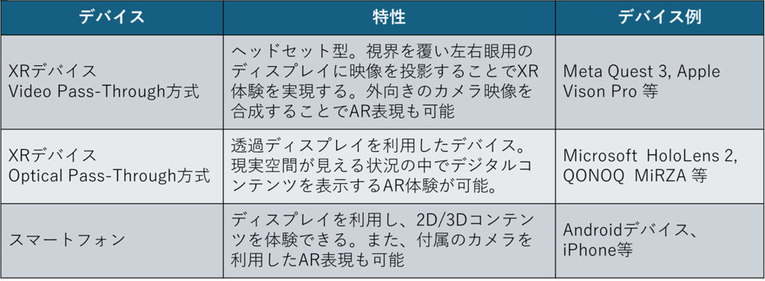 前章ではXRコンテンツ開発の手法について解説を行った。実際に開発したコンテンツを利用者が体験するためにはデバイスが必要になる。デバイスについても近年では様々なものを活用することができる。ここでは、XRコンテンツを体験するためのデバイスの種類や特性について述べる。