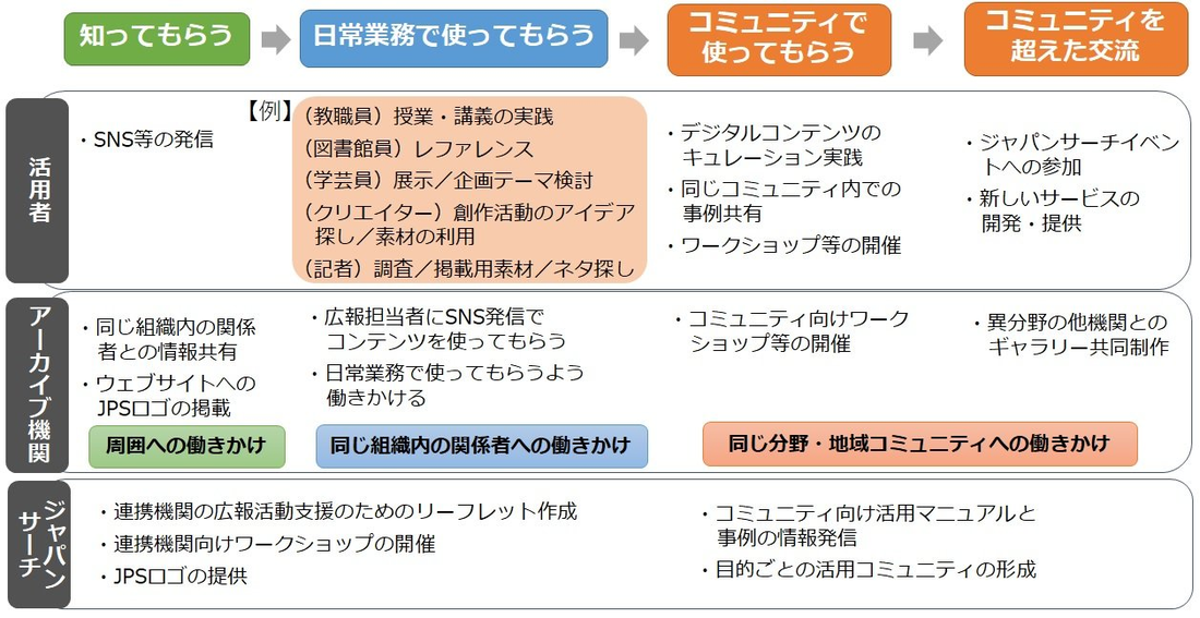 図13_デジタルアーカイブの活用における各活動主体のアクション ((C)デジタルアーカイブジャパン推進委員会実務者検討委員会) |