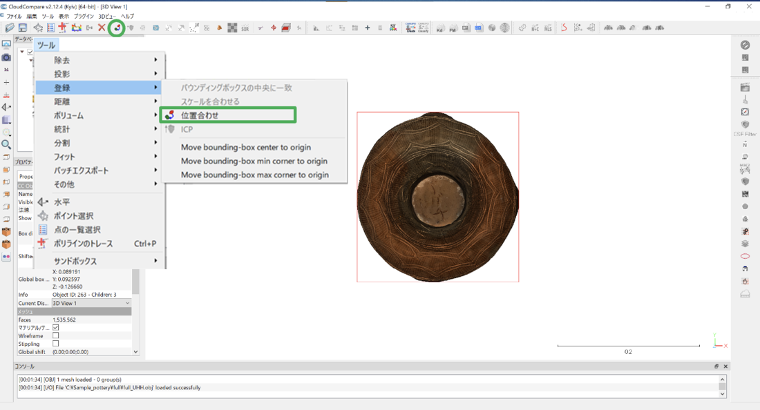 なおCloudCompareの座標系は数学座標系なので、正面(x-y平面)を基準として左下→右上、または手前→奥に座標値が増加する。ツールメニューの「登録」から、「Move bounding box min corner to origin」を選択すると、座標軸原点は正面左下手前にセットされる。「Move bounding box center to origin」を選択すると、座標原点はモデルの重心(xyzの中央値)にセットされる。回転軸に対して非対称の形状(大きな装飾突起など)でなければ、座標原点をモデルの重心にセットすることで、回転軸と座標軸を一致させることができる。以下、参考までに作業手順を紹介する。