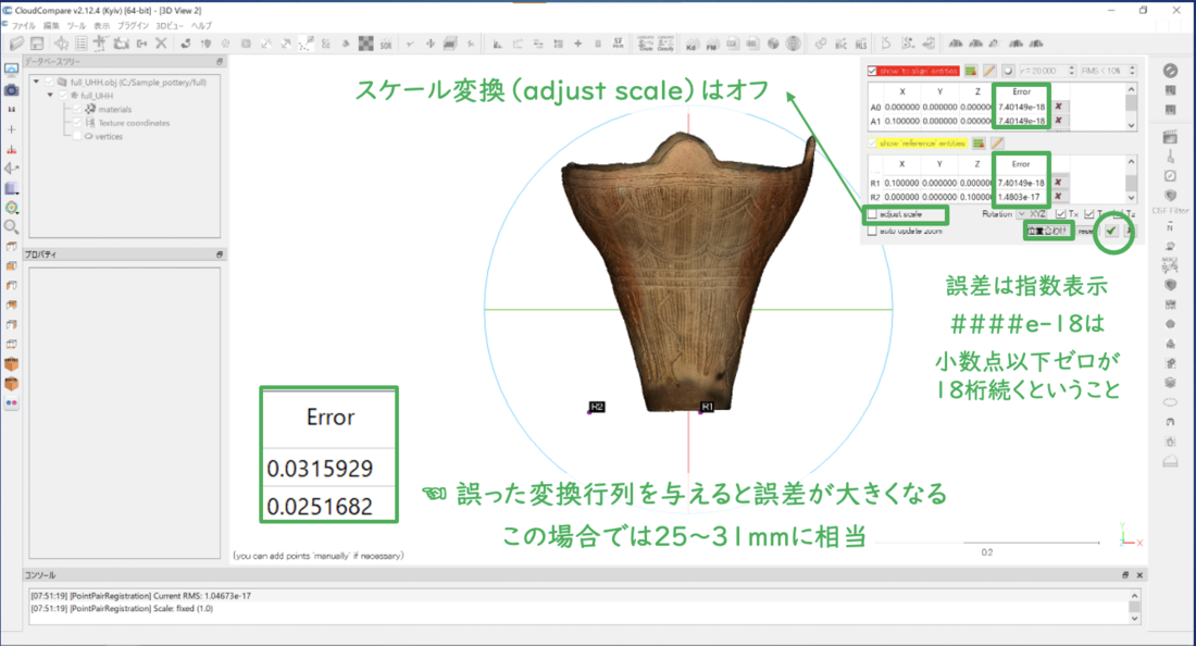 またメッシュモデルの法線ベクトル(normal)を使用した陰影をノーマルマップとして焼き込み(ベイク)している場合(仲林2021)、CloudCompareではノーマルマップをサポートしていないため、読み込んだメッシュ・点群の法線ベクトルしか利用できない。最終的な出力画像の解像度や精細さについて、以上を注意する必要がある。