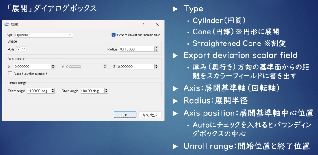 ・Axis:展開基準軸(回転軸)、ここではy軸を高さ方向に設定し基準軸としている