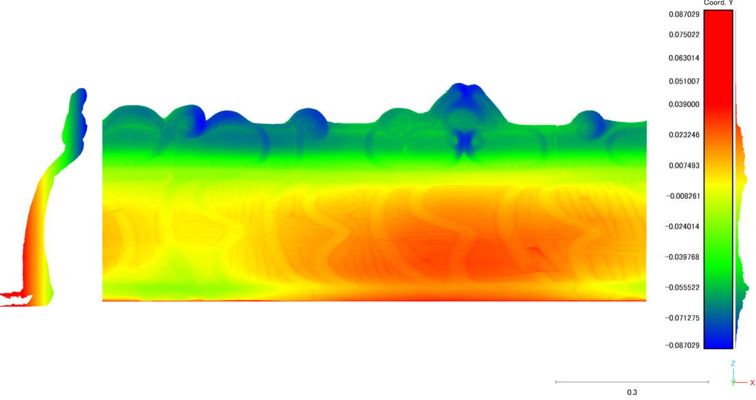 また作成した円筒展開点群は、完全な平面に投影されたものではなく、実際には回転軸を基準に「切り開かれた」、すなわち奥行方向の厚さ(高さ)情報を持ったものである(図20)。このため、例えば展開面に対する土器表面の文様等の厚み、高低の変化を色段彩として示すこともできる(図21)。
